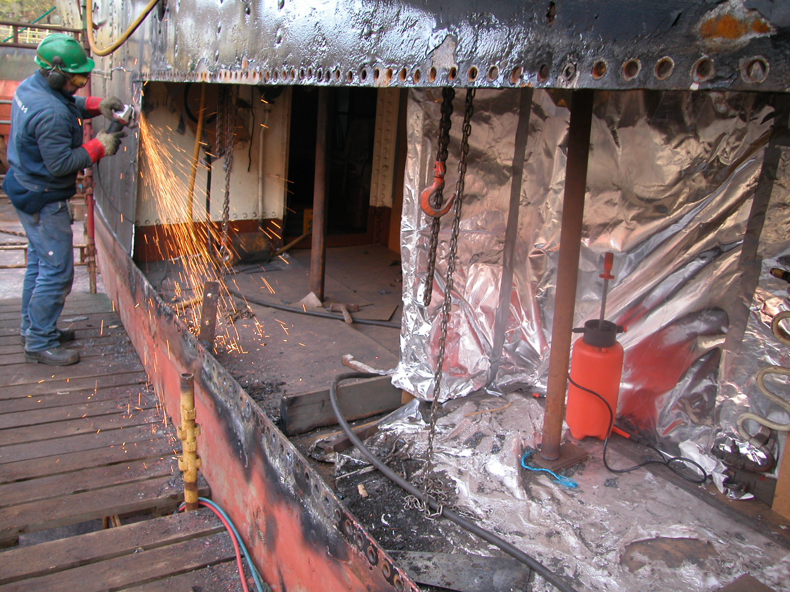 Sugerøret i hylseskottet i rørforbindelsen mellom tank og kjele ble skiftet, det ble også satt inn nye pinnebolter i skottet. Overbordventil ble reparert og lasteriggen ble utebedret.